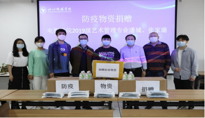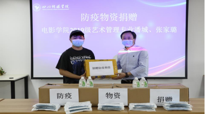 4月12日下午15:30,我院2019级艺术管理专业本科02班学生潘城、张家璐给电影学院全体师生捐赠了一批物资,物资包括了大量口罩,洗手液等时下所需应用品。