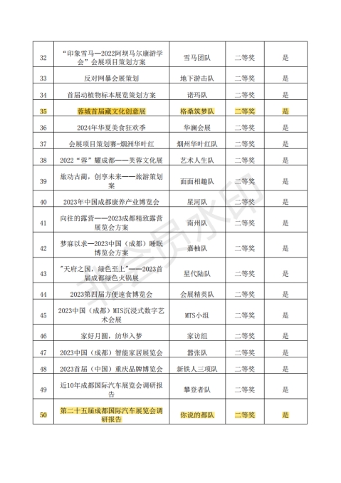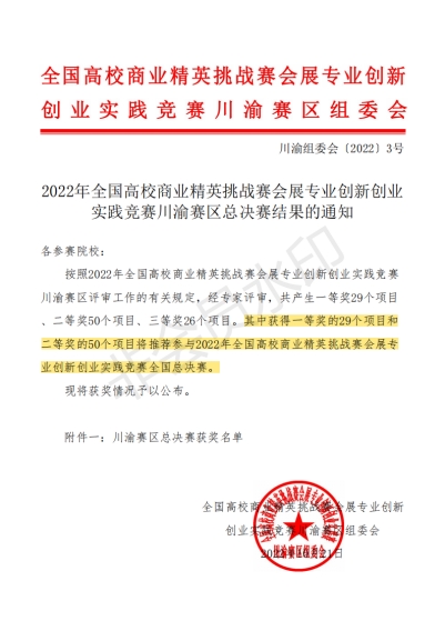 近日,2022年全国高校商业精英挑战赛会展专业创新创业实践竞赛(全国竞赛榜单第46号)川渝赛区竞赛落下帷幕,本届赛事分设会展项目策划赛、数字会展项目策划赛、会展城市营销策划赛、会展项目调研赛和会展项目设计赛等5个赛项。按照评审工作的有关规定,经专家评审,共产生一等奖29个项目、二等奖50个项目、三等奖26个项目。其中获得一等奖和二等奖的项目将推荐参加2022年全国高校商业精英挑战赛会展专业创新创业实践竞赛全国总决赛。