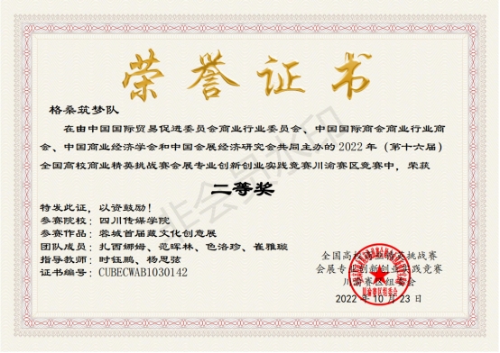 我院共获得该赛事川渝地区二等奖两项,分别为:由时钰鹏、杨思弦老师执导,2019级文化产业管理02班的扎西娜姆、范晖林、色洛珍和崔雅璇组成的“格桑筑梦队”创作的“蓉城首届藏文化创意展”;由时钰鹏老师执导,2020级文化产业管理01班的秦榕蔓、王雨萌、罗红梅和章海影组成的“你说的都队”创作的“第二十五届成都国际汽车展览会调研报告”。