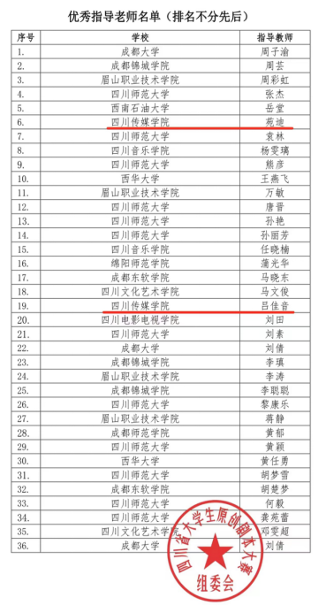 2022年四川省原创剧本大赛获奖名单公布,电影学院杜静、张妍等20位同学从1000多支参赛团队中脱颖而出,共收获一等奖4项,二等奖6项,三等奖8项;电影学院教师苑迪、吕佳音等获优秀指导教师奖2项,四川传媒学院再获优秀组织奖!