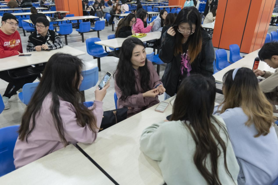 (晚间,专业教师在食堂指导学生分组讨论)