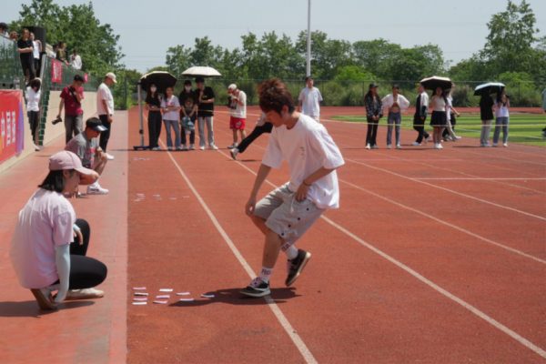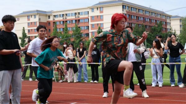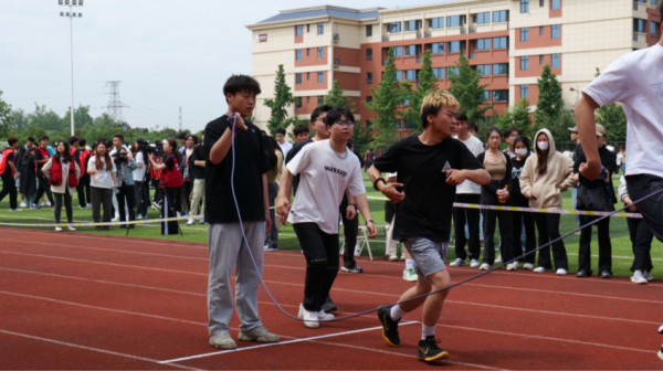 电影学院的队伍通力合作,跳绳在地上击打出有节奏的声音,我们学院的队员快速起跑,纵深一跃,动作行云流水,尽显青春活力。