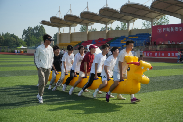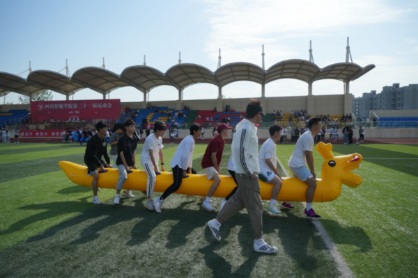 这不仅是一项体育娱乐活动,更是速度与默契相融合的比赛,“旱地龙舟”看似简单但做起来却不容易,讲究的是全体参赛人员的配合,展现的是电影学院同舟共济的团结协作精神。