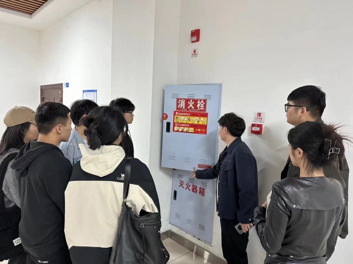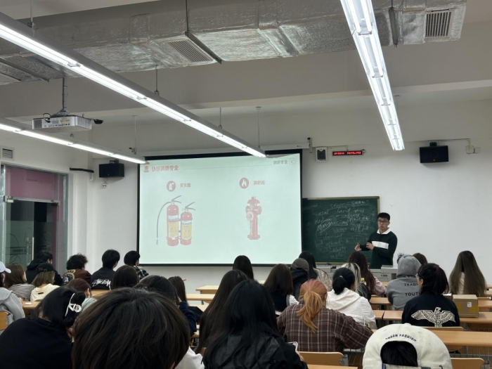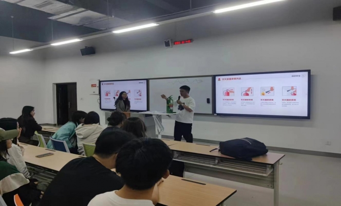当遇到火灾是如何逃生又是一个关键问题。主题班上要求各位同学遇到火灾一定要做到以下三点:第一,遇到火灾时不能慌乱,不能大喊大叫,要组织有秩序的逃生;第二,如逃生必经路线充满烟雾,要用湿毛巾或衣物捂住脸部,防止吸入有毒烟气,并降低姿势或葡匐在地前进;第三,从火场逃生时可将浸湿的棉大衣、棉被、窗帘、毛毯、等遮盖在身上,防止被火烧伤。主题班会最后为同学们讲解了二氧化碳灭火器、1211灭火器、消防栓与水带等灭火装置使用方法。各位辅导员还带领同学们认识所在教学楼有哪些消防设施如何进行使用,熟悉消防通道所在的位置。