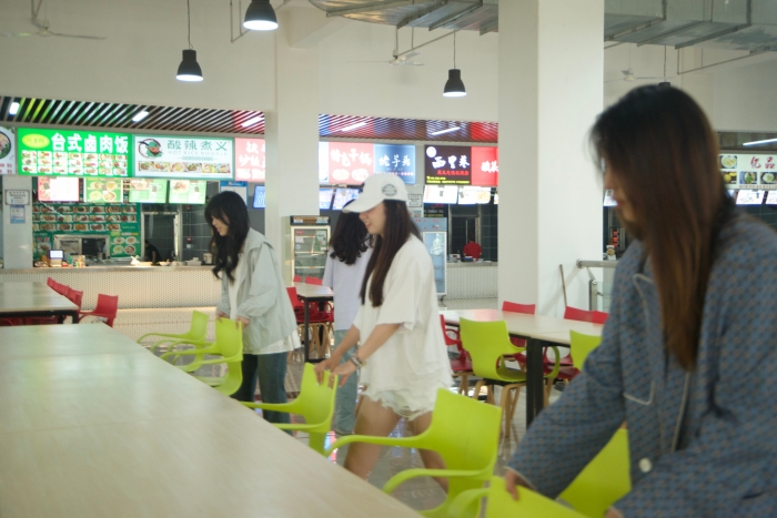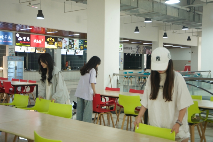 食堂是学生们日常就餐的地方,这里的整洁与否直接关系到大家的饮食体验。同学们分成小组,有的负责擦拭餐桌椅,不放过任何一个污渍和角落;有的拿着扫帚清扫地面,将杂物清理得干干净净。他们彼此协作,配合默契,在忙碌中感受着劳动带来的充实感。