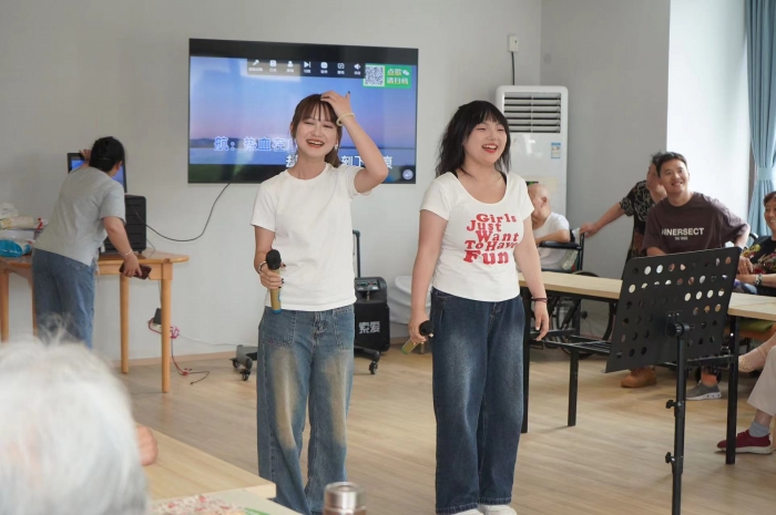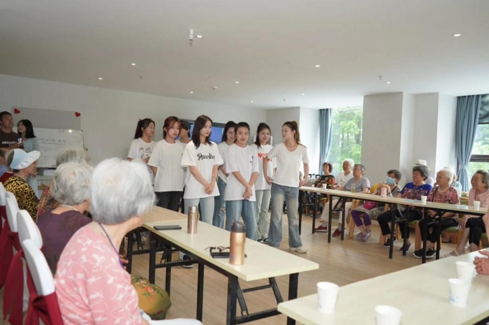 随后,党员同志和积极分子们还精心为老人们准备了一场丰富多彩的表演活动。歌曲、舞蹈等节目轮番上演,现场气氛热烈欢快。大家用他们的才艺和热情感染了在场的每一位老人,大家一同沉浸在欢乐的海洋中。特别是几位老人家主动上台与学生们互动,整个活动室响起了阵阵掌声与欢笑声。