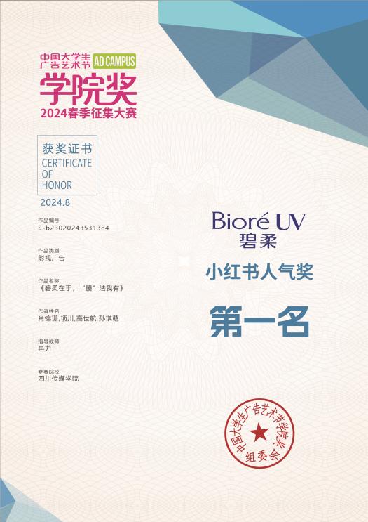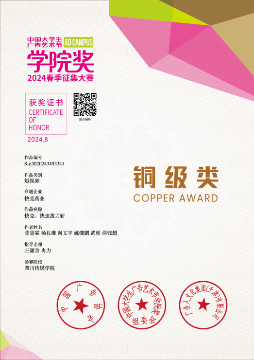 2024年8月24日,2024年春季“中国大学生广告艺术节学院奖”颁奖典礼在北京广播大厦隆重举行。由我院专业教师王潇余、冉力指导的作品《快克,快速拔刀斩》《碧柔在手,“膜”法我有》分获学院奖“全国铜奖”、“小红书人气奖第一名”,两部优秀广告作品分别由2021级戏剧影视导演学生项川、向文宇担任导演,其作品均在活动现场进行展演,两名指导教师均获“优秀指导教师”证书。