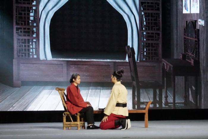 第二篇章聚焦蜀汉风云,诸葛亮病重之际仍心系汉室复兴大业,对姜维的临终嘱托感人至深,尽显忠诚。姜维坚定回应,表明继承遗志的决心。营帐内灯光昏暗,气氛凝重,同学们伴奏的歌声更是烘托出这份为国家鞠躬尽瘁的壮烈情怀,令在场师生动容。