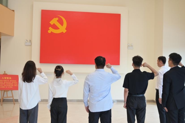 活动由电影学院分党委书记王国泰、学生支部书记郭婧带队。在“奋斗与辉煌 —— 中国共产党 100 年礼赞展” 展厅内,全体师生党员身着正装,面向鲜红的党旗庄严举起右拳,重温入党誓词,铿锵有力的誓言回荡在展厅,不仅是对党的忠诚承诺,更饱含着新时代师生传承红色血脉、勇担时代使命的坚定决心。