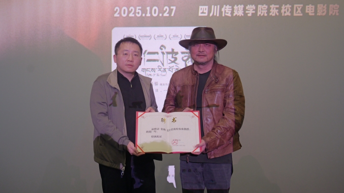 活动伊始,领导嘉宾与全体师生一同观看了张杨导演的代表作之一——影片《冈仁波齐》。影片以纪录片式的拍摄手法,讲述了一群藏族村民徒步朝圣的心灵旅程,以其独特的叙事视角和纯粹的影像语言,引发了师生们的深切共鸣与思考,随着影片演职人员表滚动结束,现场响起了热烈的掌声。随后,四川传媒学院校长左旭舟教授上台致辞,对张杨导演的到来表示热烈欢迎与诚挚感谢,并高度评价其在中国电影创作领域的卓越成就与艺术贡献。左旭舟校长指出,张杨导演的作品兼具现实温度与人文厚度,充分体现了电影创作者应有的社会关怀与精神追求。随后,左旭舟校长代表学校向张杨导演颁发了四川传媒学院客座教授聘书。