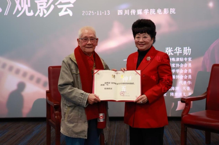 观影结束后,四川传媒学院理事长张书玉教授代表学校,为张华勋导演颁发四川传媒学院客座教授聘书。聘任仪式不仅体现了学校对张华勋导演艺术成就的高度认可,也标志着双方将在影视创作、专业建设与人才培养等领域展开更加紧密的合作。